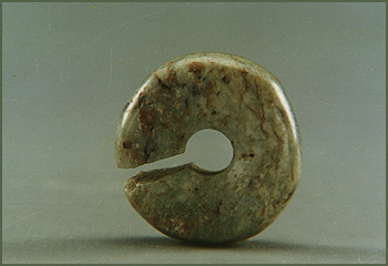 Fig. 26 - Due immagini di un ciottolo fluviale di giadeite, parzialmente lavorato, proveniente dal sito di Las Huacas, penisola di Nicoya, Costarica, conservato al Carnegie Museum of Natural History, Pittsburgh (USA). Sono evidenti la “mandorla” sulla faccia piatta, residuo del taglio di una sezione effettuato mediante sega a corda, e la tacca di inizio taglio su una delle facce laterali. Il lavoro è datato tra il III sec. a.C. e il V sec. d.C., il minerale proviene con tutta probabilità dalla valle del rio Motagua, in Guatemala (dim. cm. 6.1 x 11.8). Da Jade in Ancient Costa Rica, The Metropolitan Museum of Art, NY, 1998